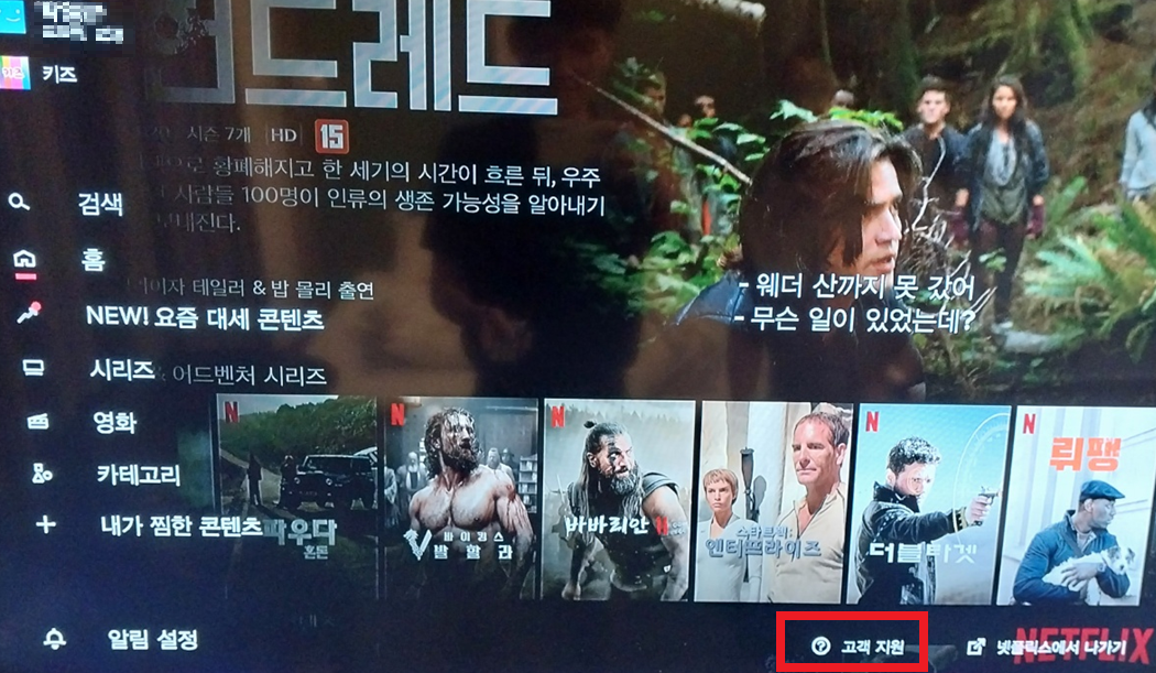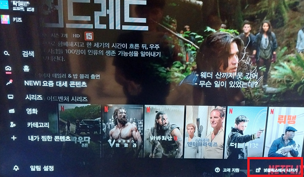 상단과 같이 메뉴 화면에서 '넥플릭스에서 나가기' 버튼을 누르면 아래와같이 메인화면으로 돌아가는것을 의미하지 로그아웃 되는것이 아닙니다.