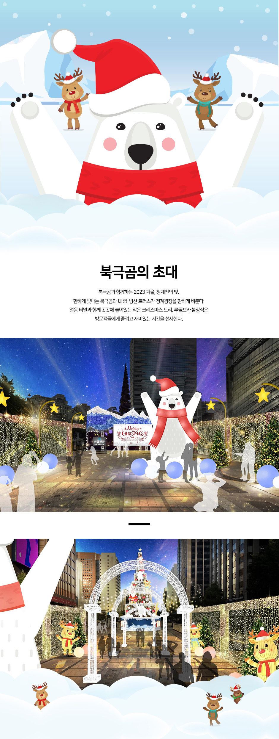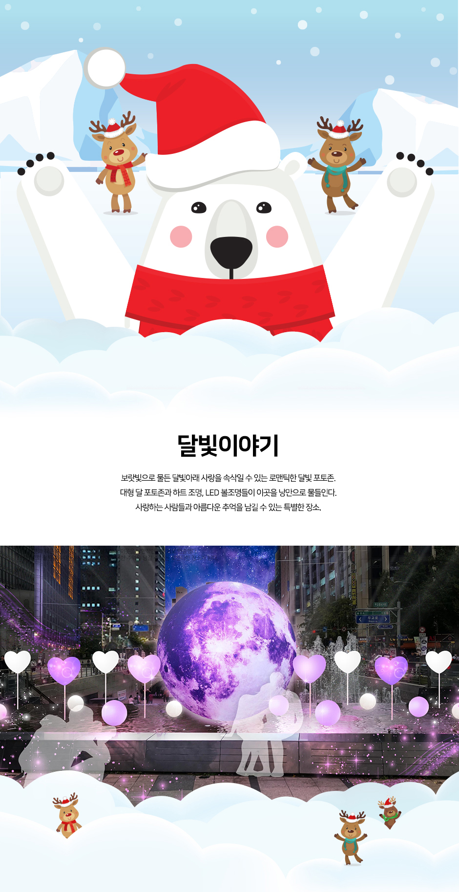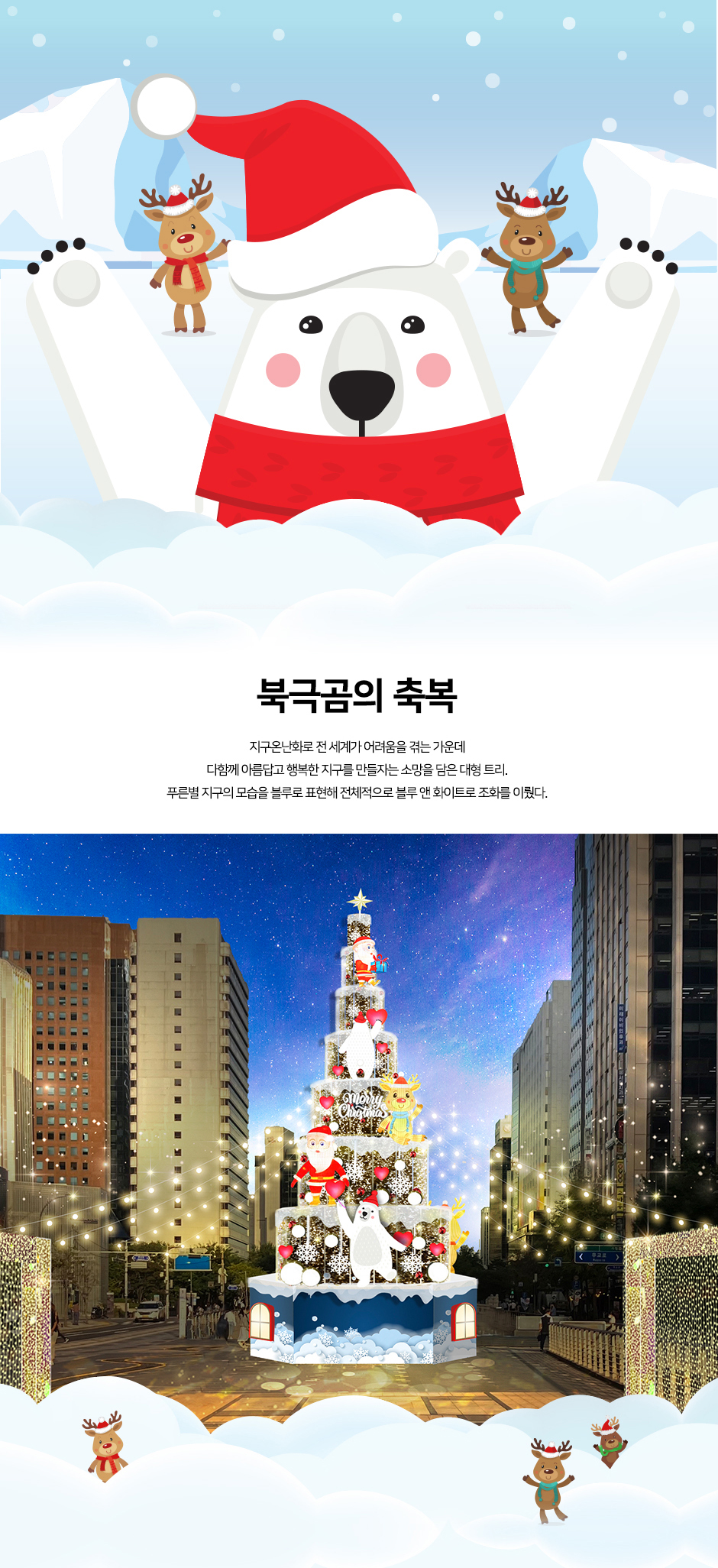 지구의 모습을 블루/화이트로 연출한 대형 트리, 북극공과 빙산 장식 및 아름답고 행복한 지구를 만들려는 소망을 빛으로 담았습니다.
