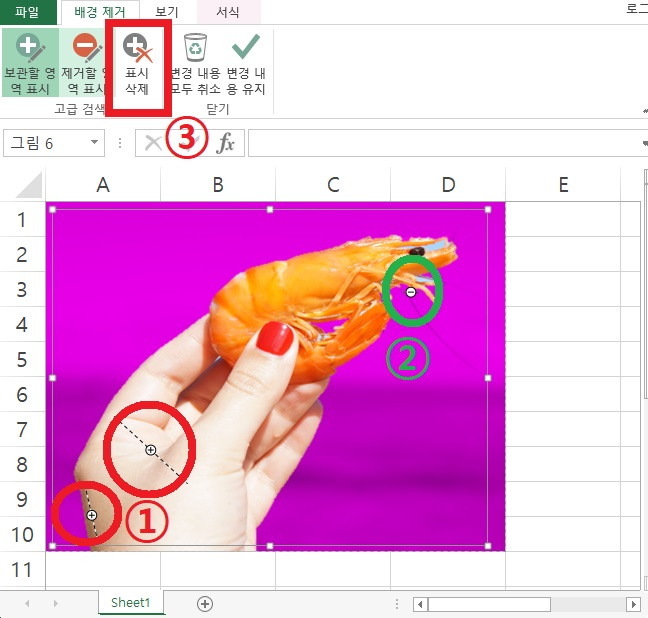 '제거할 영역 표시' 를 상단 텝에서 클릭한 후 ②표기점 처럼 클릭-드래그 하여 새우의 수염은 잘라냈습니다.