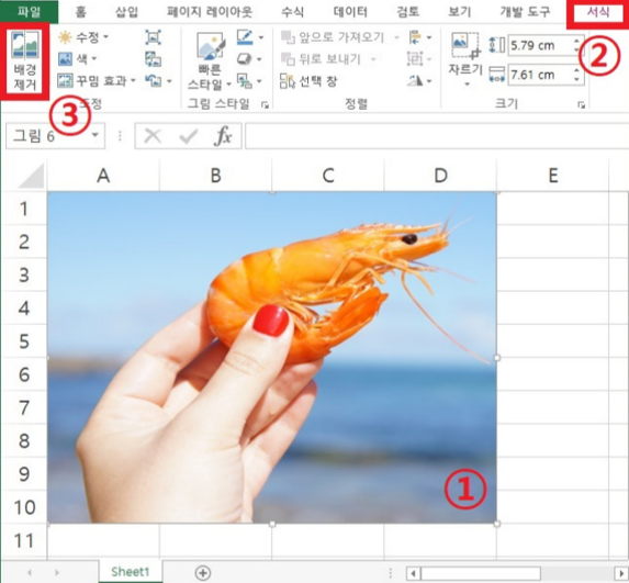 ①처럼 원하는 그림을 선택하고, ② 서식 텝에 들어갑니다. ③배경제거를 클릭합니다.