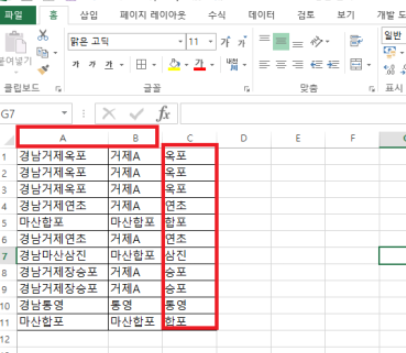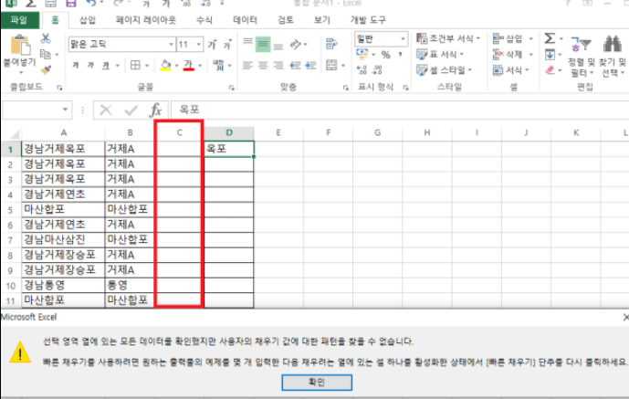 빠른채우기 기능을 사용할 때 주의할점은, 반드시 열이 인접해야 한다는 것입니다. 위 사진에서는 기존 B열에 있던 자료들을 A열로 옮긴 다음 빠른채우기 기능을 C열에 적용해보았습니다. 보시는바와 같이 추출되는 결과는 동일합니다. 열의 위치는 작업의 결과와 상관이 없습니다. 다만, 반드시 셀들이 인접해야 오류가 나지 않습니다.