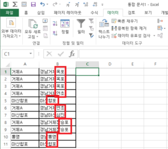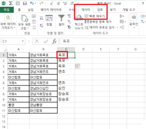 ① C1셀에 B1셀의 마지막 2글자 '옥포'를 입력해줍니다 → 첫번째 규칙을 컴퓨터에 인식시켜주는것임