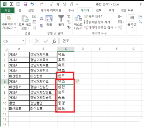 위 순서대로 작업을 하면 C열에 1차로 가공된 자료들이 자동으로 입력됩니다.