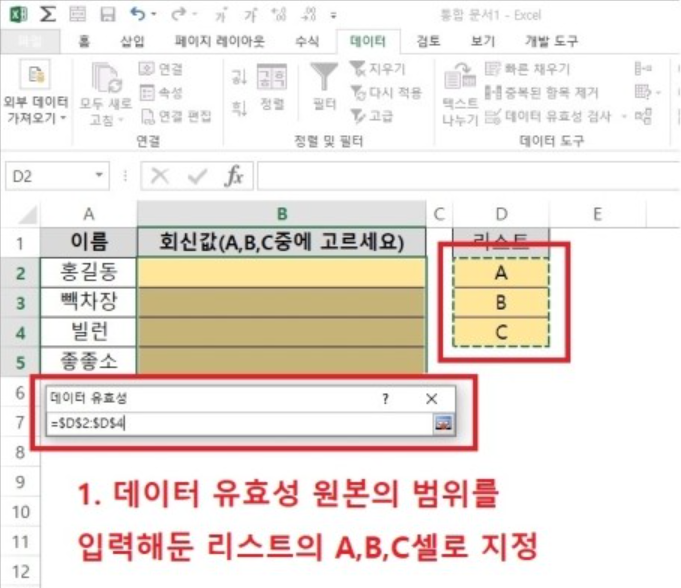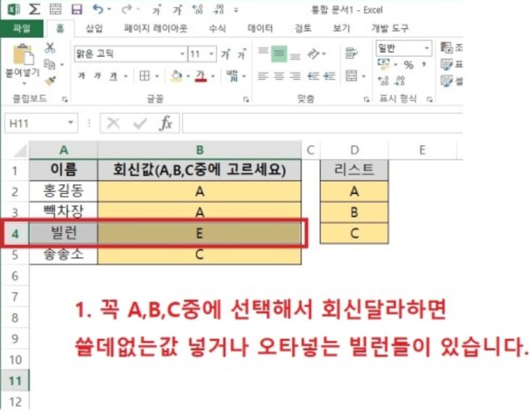 A, B, C 리스트 안에 값만 입력했으면 좋겠는데, 취합자료 메일요청을 보내면 꼭 E처럼 항목에 없는 예외값을 입력하는 사람이 있습니다. 이런경우 자료를 일일이 확인하고 가공하는데 시간이 많이걸리겠죠?