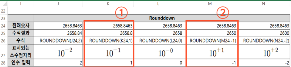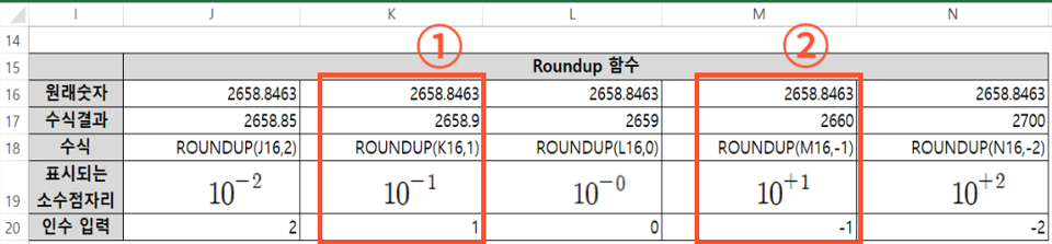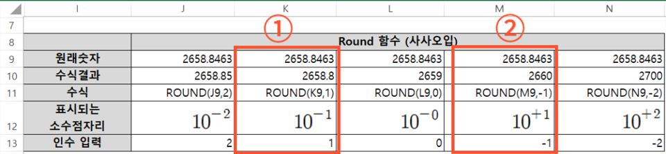 3. ②예시: 2658.8463에서 정수 2째자리(10의 1제곱)까지 표기하고 싶다면, 두번째 인수는 -1을 입력하면 됩니다.