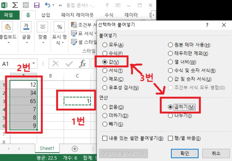 ③ 콤보버튼은 [값(V)] , [곱하기(M)] 선택하고 [확인] 버튼을 누릅니다.