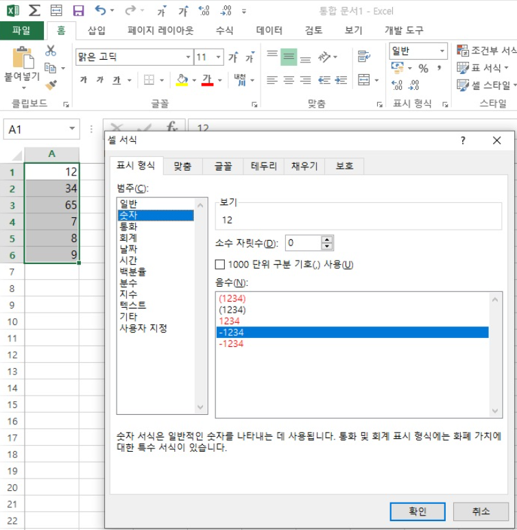 ② [표시형식]을 [텍스트] 또는 기타 형태가 아닌 [숫자] 형태로 지정한 후 [확인]을 누릅니다.