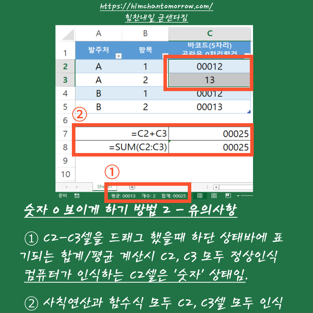 사용자 지정 서식에서 자리수를 00000으로 표기하면, C2셀은 컴퓨터가 '숫자'인 자료로 인식합니다. 따라서 C2셀과 C3셀을 드래그 했을때 화면 하단에 평균, 개수, 합계를 오류 없이 도출해냅니다. 추가로, 사칙연산과 함수식을 사용해도 모두 C2셀을 숫자로 인식하기에 정상적으로 연산이 됩니다.