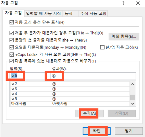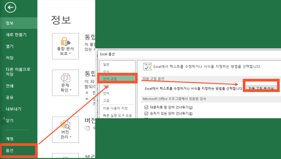 [파일] → [옵션] →[언어교정] →[자동고침옵션] 들어갑니다
