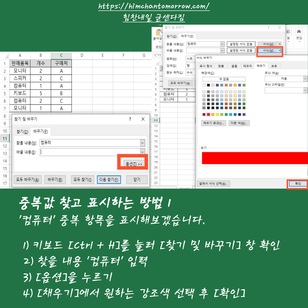 중복데이터 '컴퓨터'를 찾아보겠습니다. 첫번째 방법은 키보드 단축키 Ctrl + H를 활용하는 방법입니다. Ctrl + H 를 누르면 [찾기 및 바꾸기] 창이 활성화 됩니다. 이때 찾을 내용 '컴퓨터'를 입력하고 [옵션]을 눌러 [채우기]텝으로 이동합니다. 그리고 중복값이 보이면 눈에띄게 표시할 배경색을 고른 후 [확인] 버튼을 누릅니다.