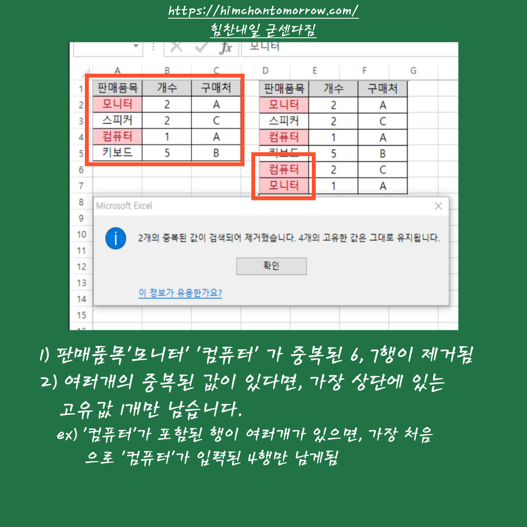 판매품목에서 '모니터'와 '컴퓨터' 모두 중복값이 있는 항목이기 때문에 우측그림에 있는 6행과 7행은 왼쪽 그림에서 제거되었습니다. 중복된 데이터가 차트 내에서 여러개가 존재한다면, 가장 상단에 위치한 첫번째 고유값은 남습니다.