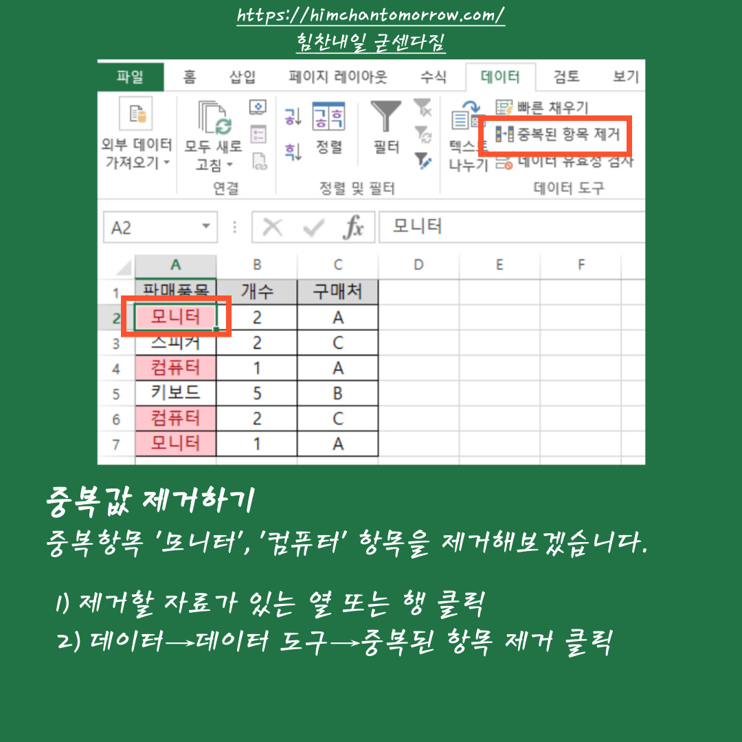 엑셀작업 하시면서 중복된 값이 분명 있는것 같은데 일일이 찾기 힘들었던 적 있으시죠? 아래 내용을 잘 숙지하시면 중복값 빨리 찾고 순식간에 제거하실 수 있습니다!