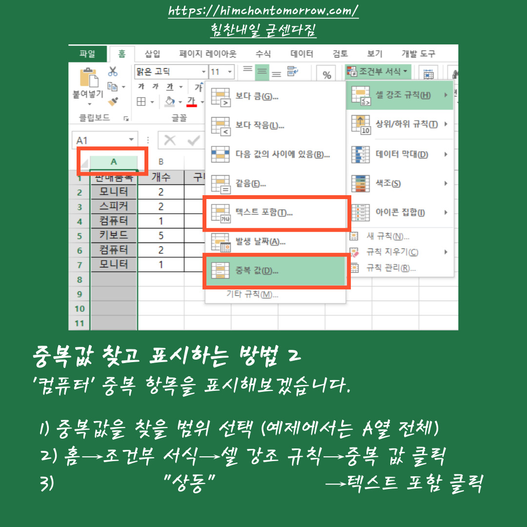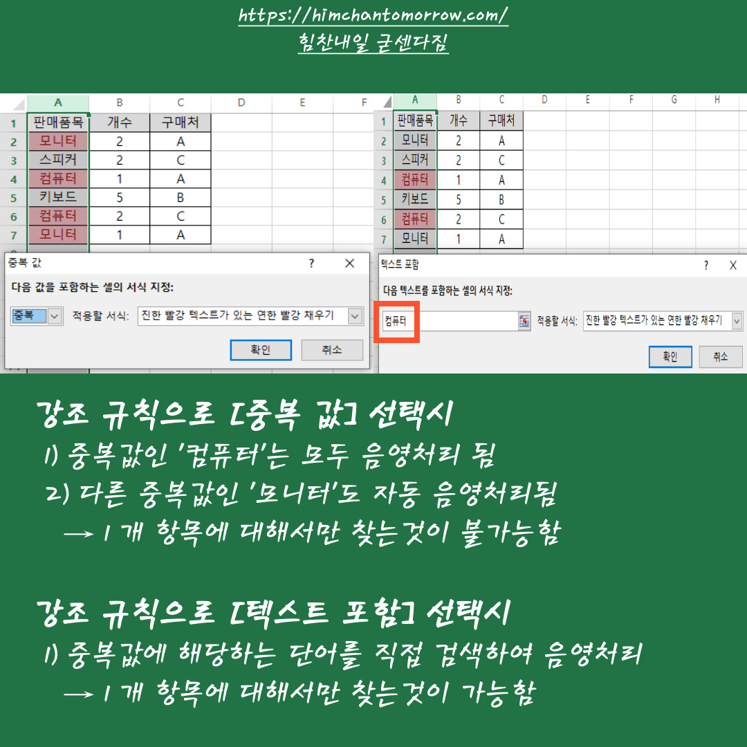 왼쪽 그림과 같이 [중복 값] 버튼을 클릭하면, '컴퓨터'를 포함하여 다른 단어들도 중복으로 나타난다면 강조색이 들어갑니다. 오른쪽 그림과 같이 [텍스트 포함] 버튼을 클릭하면, 내가 강조할 단어만 입력(컴퓨터)할 수 있습니다.