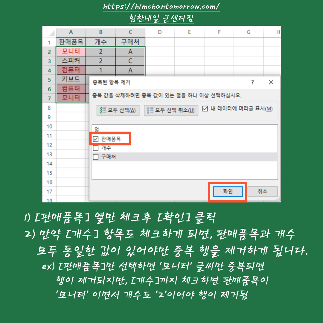 저는 중복된 단어를 찾을 때, '판매품목'만 중복되면 행을 삭제할 것입니다. 따라서 중복된 항목 제거 옵션에서 '판매품목'만 선택 후 [확인] 버튼을 눌렀습니다. 판매품목과 개수 모두 동일한 값을 삭제하고 싶다면, '판매품목'과 '개수'를 모두 체크하시면 됩니다.