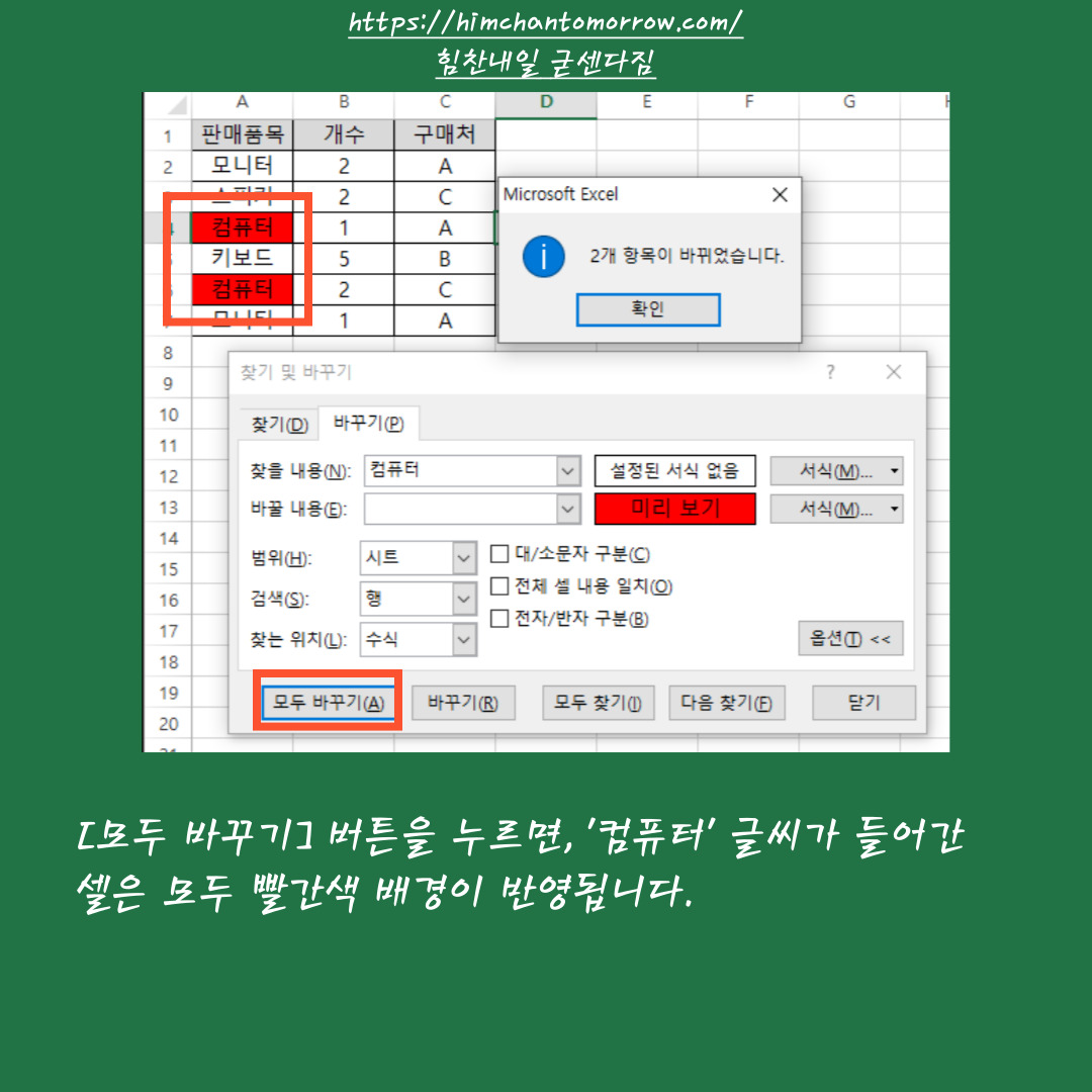 [모두 바꾸기] 버튼을 클릭하면, '컴퓨터'가 포함된 모든 셀은 빨갛게 강조됩니다.