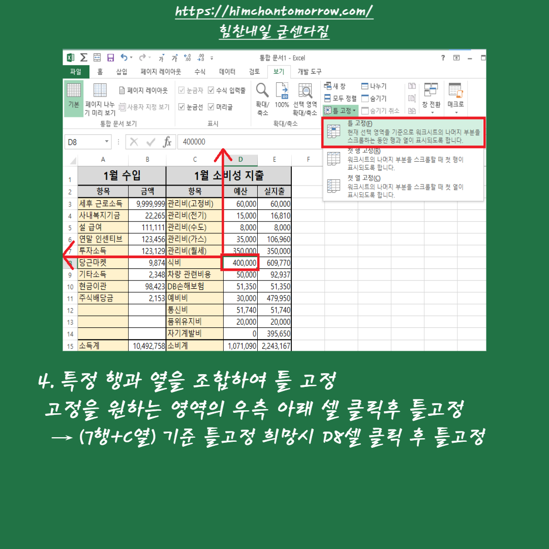 마지막으로, 내가 원하는 특정 행과 열을 조합하여 틀고정을 할 수도있습니다. 예를들어 저는 A~C열과 1~7행을 까지의 범위를 고정하여 보고 싶습니다. 이경우 해당 범위의 우측 아래 셀(D8셀) 을 클릭한 후 틀고정을 클릭하면 됩니다.