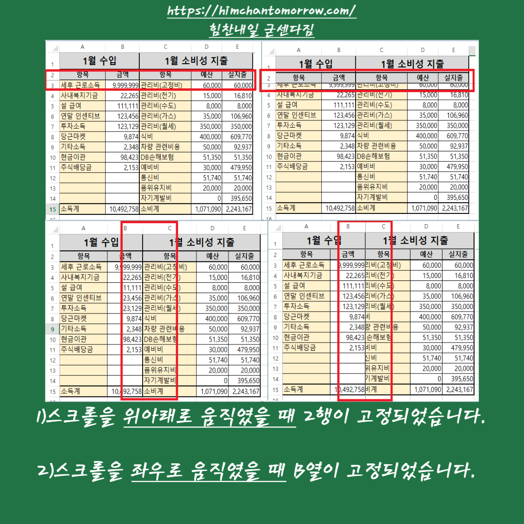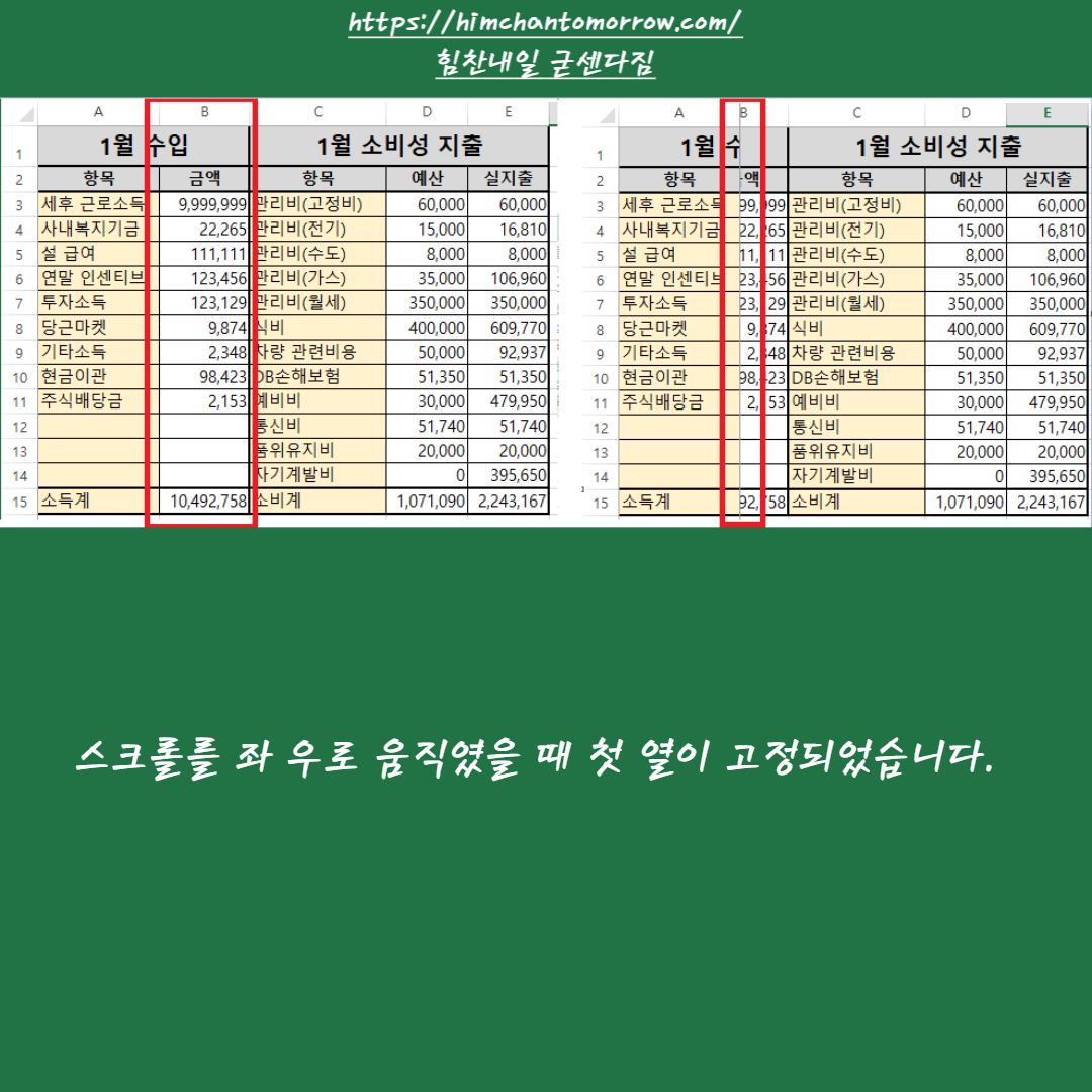위에 사진을 보면 2열까지 고정시키고 나니 스크롤을 위아래로 움직였을 때 수입 지출 행 뿐만 아니라 항목, 금액, 예산, 실지출 항목까지 타이틀이 고정되었음을 알 수 있습니다. 아래 사진을 보면 스크롤을 좌우로 이동시 1월 수입 항목과 금액 전체가 고정된 상태로 자료를 볼 수 있음을 확인할 수 있습니다.