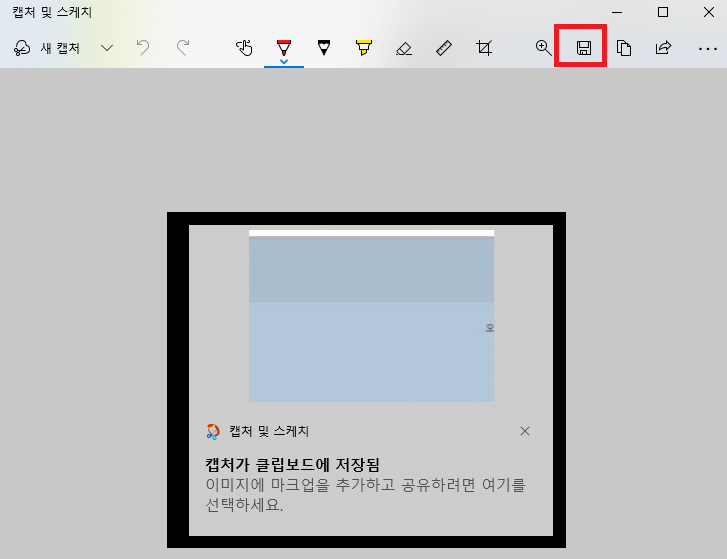 ② [캡쳐 및 스캐치 창]이 활성화 되면, 우측 상단에 저장 그림을 눌러서 그림파일로 저장하면 됩니다.