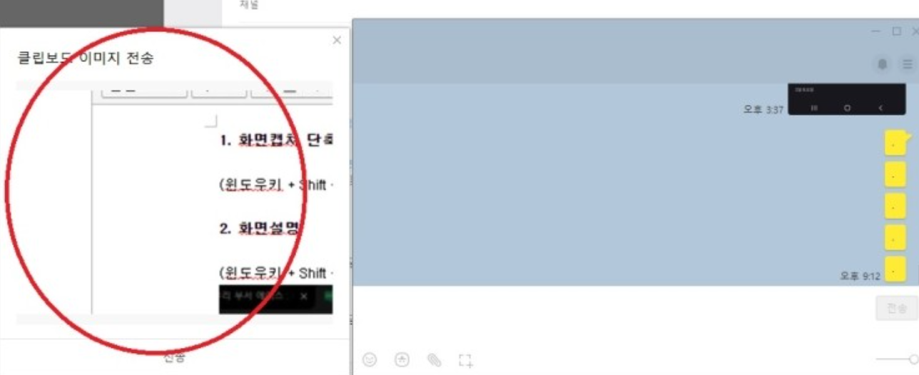 위 그림과 같이, 카톡 대화 대기창에서 [Ctrl] + [V]를 누르면, 따로 수정 소요 없이 바로 카톡창에 복사 이미지 전송이 가능합니다.