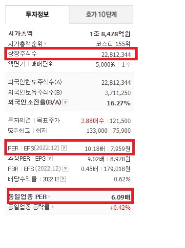 PER 10 적용, 23년 예상 지배주주 순이익 2,048억, 상장주식수 22,812,344주 적용 시 10*2,048 = 20,480억(목표시가총액)입니다. 20,480(억)/22,812,314 = 89,776원.23년 말기준 예상 목표주가는 89,776원이므로 현재 가격 81,000원과 비교 시 8천 원 정도 상승여력이 남아있습니다. 위 내용이 절대적으로 맞다는 보장은 없습니다. 다만, 투자하실 때 참고하셔서 느낌으로 투자하지 마시고 현재 주가가 고평가인지 아니면 저평가인지 대략적인 기준은 세우시기 바랍니다. 성공적인 투자를 기원합니다.