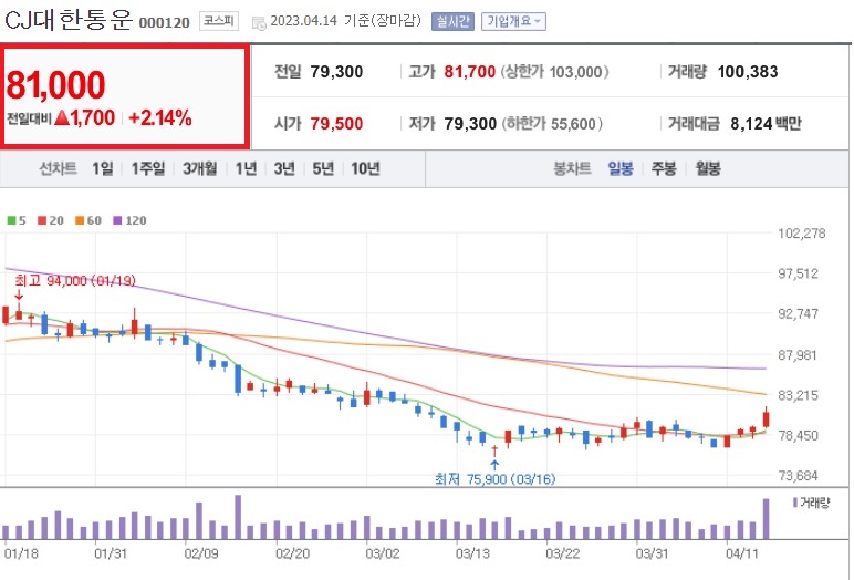4.14일 기준 대한통운 주가는 81,000원입니다. 첫째. 저는 대한통운의 적정 PER가 10 정도면 적당하다고 판단했습니다. 따라서 적정 PER(10)에 지배주주 순이익(1,816억) 곱한 값인 목표시가총액은 1조 8천억 정도입니다. 둘째, 목표시가총액 1조 천억을 상장주식수인 22,812,344주로 나누면 목표주가는 79,606원 정도입니다. 어림산인 점 고려했을 때 지금 주가는 딱 적당한 수준입니다.