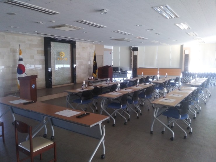 실제 면접장이다. 교실 1개정도 크기 된다. 내가 사전방문 했던 날은 무슨 회의가 있었는지 책상이 사진처럼 배치되어있었다. 실제 면접은, 창가쪽이 파인쪽이 되도록 ㄷ자로 배치하고, ㄷ자 안쪽에 면접자용 의자 1개만 놓아둔다. 책상이 면접자의 다리를 가리는 형태가 아니기 때문에 긴장해서 다리를 떨거나 하면 다 드러난다. 진짜 의자만 1개 둔 형태였다.